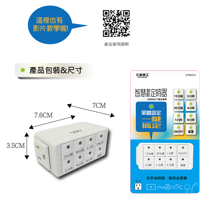 ◆商品特色 1. 6款倒數時間提供設定。 2. 24小時循環倒數功能。 3. 單鍵設定 一鍵搞定,世界超級簡單。 4. 2P/3P電器皆可使用。 5. 1000W以下商品適用。 6. 預防電動車、手機等電池過充電,延長電池壽命。 7. 預設電器使用關閉時間。如電風扇、電燈、電視。 8. 減少電器3C產品待機時間,有效節電省錢。 9. 適用燈飾照明、水族魚缸、電風扇、熱水瓶、電鍋、電視、音響等。 10.投保產品責任險三仟萬。 ◆商品規格與尺寸 商品尺寸:(高)3.5x(寬)7.6x(深)7/公分 包裝尺寸:(高)20.2x(寬)1.4x(深)6.5/公分 商品重量:0.086kg 包裝重量:0.107kg 輸入端/輸出端:3P/3P 額定電壓:AC125V 最大負載:8A/1000W 額定頻率:60Hz 材質:PC、銅 產地:中國